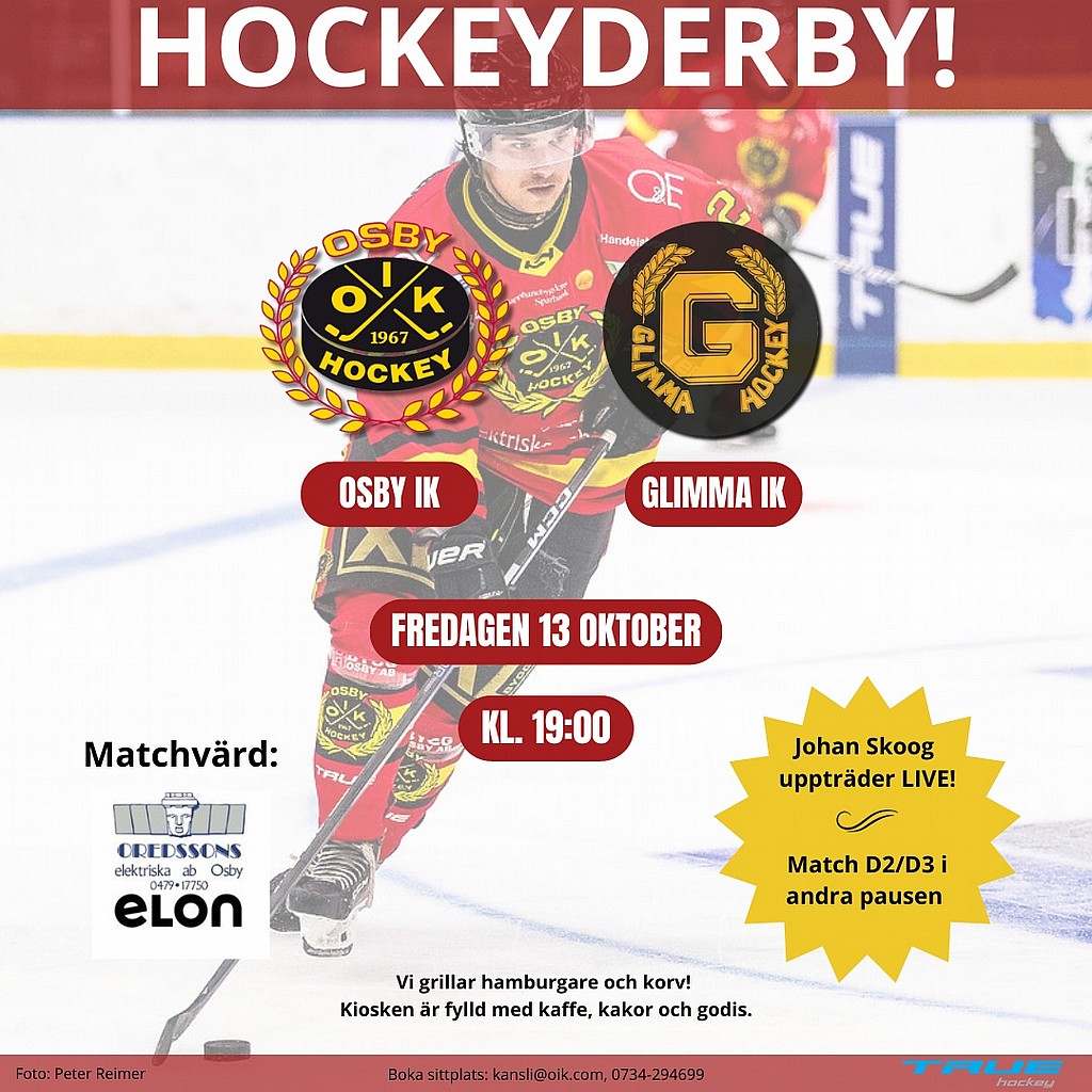 Snart är det dags för derbyt som alla vill se! Förutom en spännande match har vi en massa annat på gång. Det blir liveframträdande av Johan Skoog som sjunger den nya OIK-hymnen, D2/D3 spelar match i ena pausen. Vi grillar korv och hamburgare utomhus och kiosken är laddad med en massa gott.