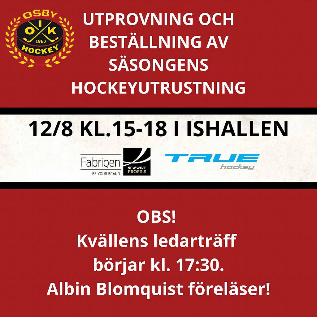 Vi påminner alla ledare om träffen på kvällen då ni förutom utbildning med RF SISU också får höra Albin Blomquist berätta om sin hockeyresa. Mail har skickats ut med inbjudan och OSA 7/8.