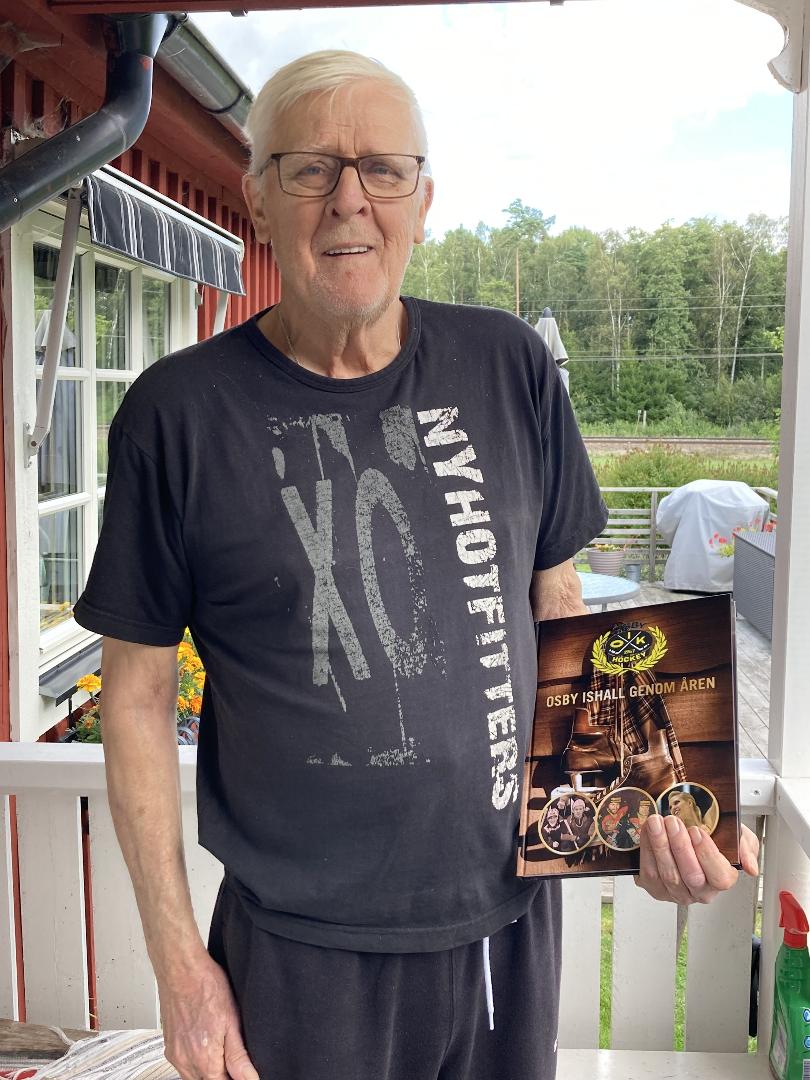 På bilden uppvaktas han med OIKs bok om Osby ishall.