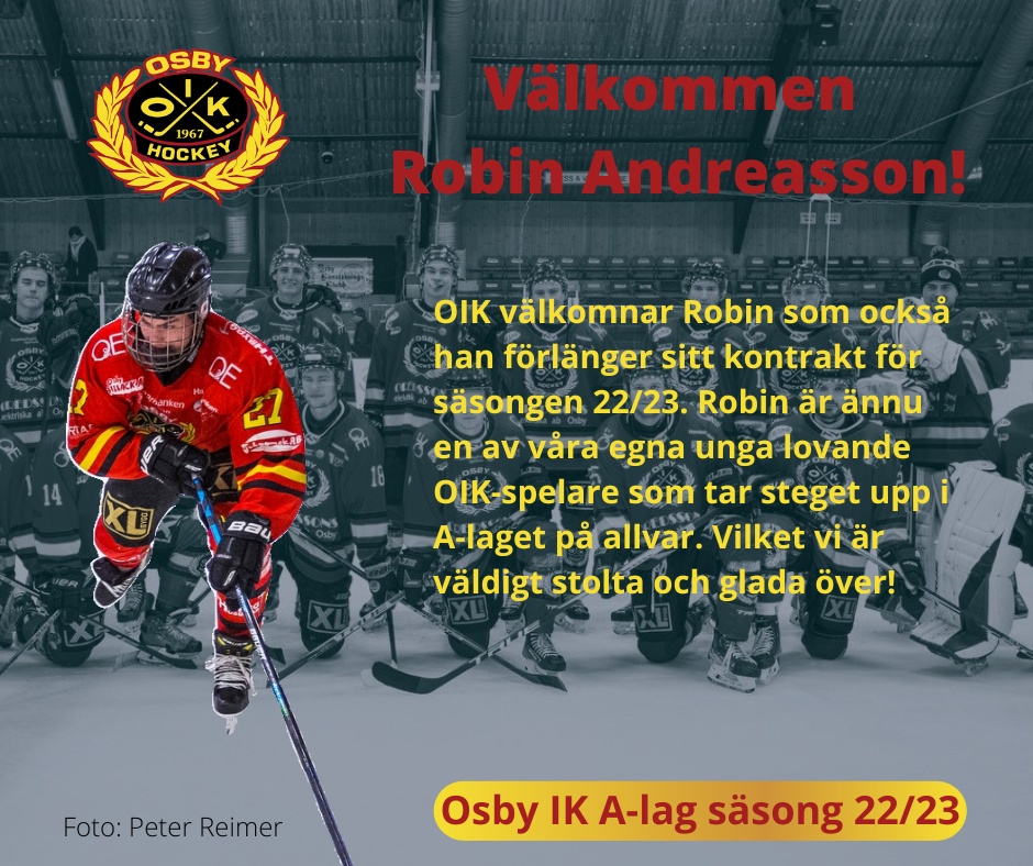 Robin Andreasson, en av OIK:s unga hockeytalanger kliver nu också upp i A-laget på allvar. Här får han en ypperlig chans att fortsätta utvecklas som hockeyspelare och det ser vi fram emot att följa!