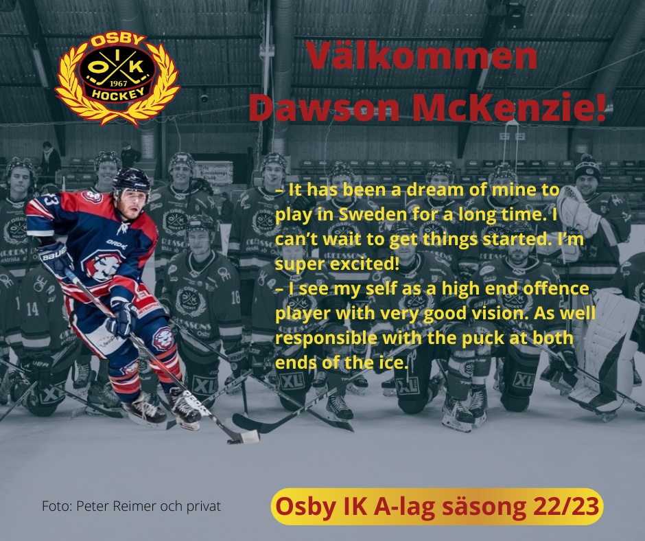 Dawson MacKenzie är kanadensaren som äntligen förverkligar sin dröm att spela hockey i Sverige. Senast spelade han för franska laget Wasquehal.Vi är glada att Dawson nu kan förverkliga sin dröm i OIK:s a-lag!