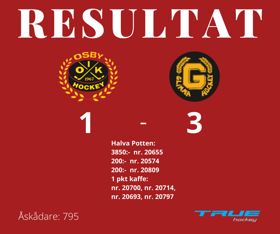 Det blev tyvärr förlust för seniorlaget i derbyt mot Glimma. Men det var på många sätt en fantastisk kväll. Hela 795 besökare fanns på plats och bjöds förutom derbymatchen på match med Hockeyskolan samt en stilfullt konståkningsnummer av OKK. Det blev även rekord i halva potten. Grattis alla vinnare!